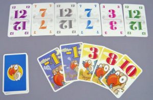 「ハゲタカのえじき」は1~15の数字カードを持ったプレイヤーが、ハゲタカのイラストが描かれた得点カードを集めて、合計点数を競うゲームです。