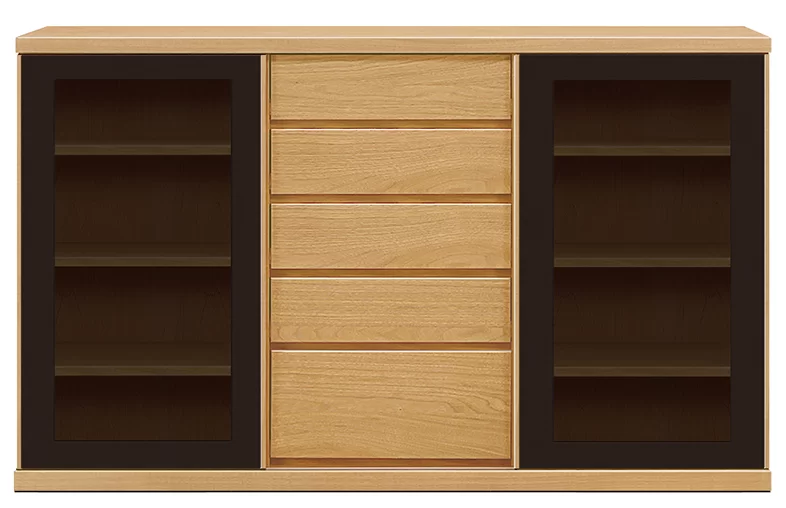 商品左右は引き⼾タイプのガラス⼾で、中央は引き出しです。商品の高さに応じて引き出しの段数が変わります。(高さ64センチ:3段、高さ80センチ:4段、高さ96センチ:5段、高さ112センチ:6段)