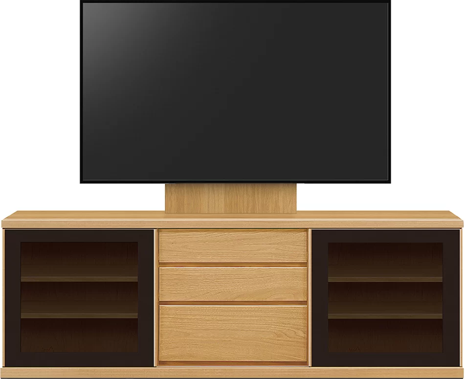 天然木突板を使用した1点ごとに木の表情の違う、シンプルながら天然木の趣が漂うシリーズです。商品左右は引き⼾タイプのガラス⼾で、中央は引き出しです。