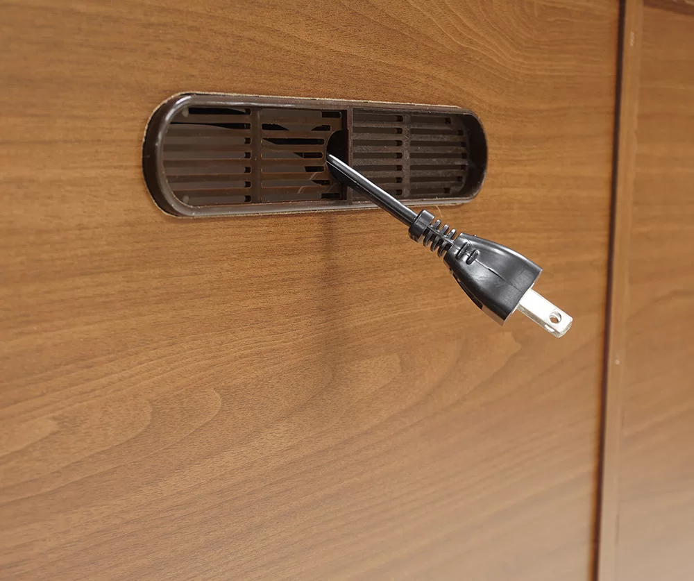 デッキ収納部に設置したデッキから商品背面にある配線孔を使用すれば、スムーズな配線が可能になります。