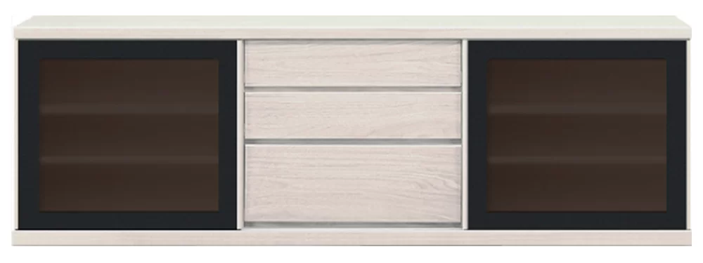 天然木突板を使用した1点ごとに木の表情の違う、シンプルながら天然木の趣が漂うシリーズです。商品左右は引き⼾タイプのガラス⼾で、中央は引き出しです。