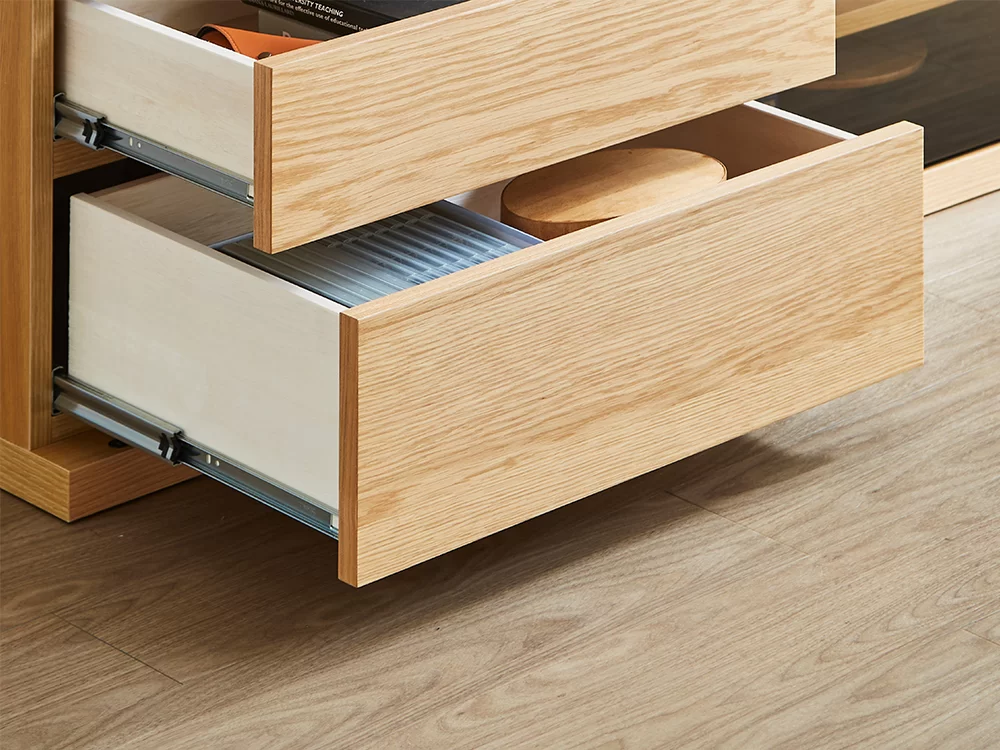 引出しはフルオープンレールを使用(※画像は幅120TVボード H45 WONA色)