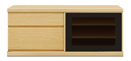 天然木突板を使用した1点ごとに木の表情の違う、シンプルながら天然木の趣が漂うシリーズです。商品左右は引き⼾タイプのガラス⼾で、中央は引き出しです。