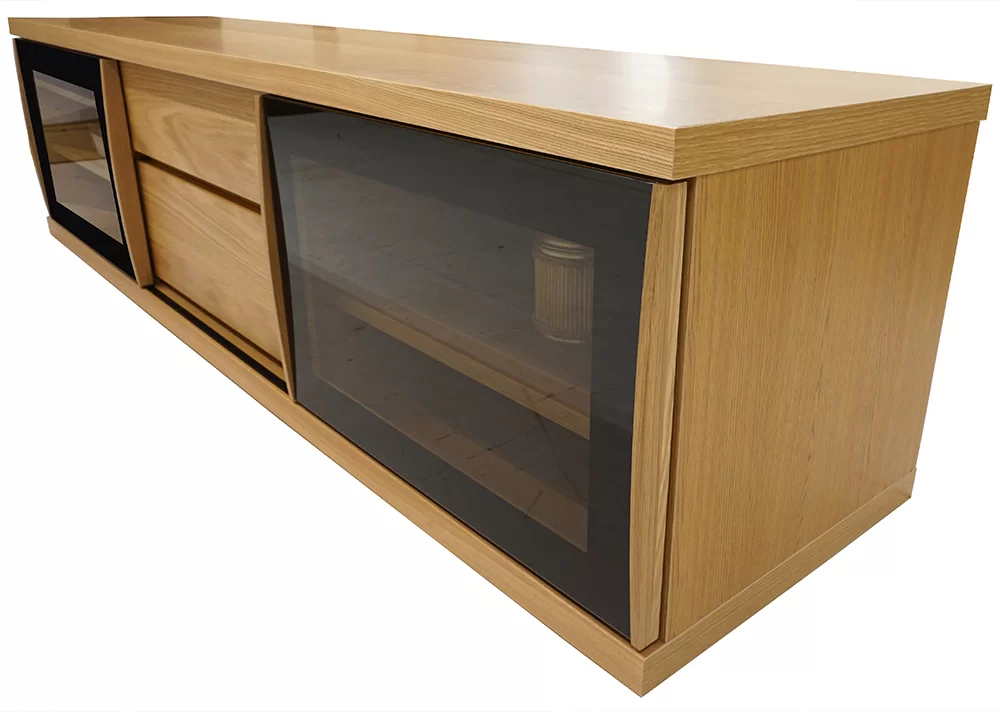 天然木突板を使用した1点ごとに木の表情の違う、シンプルながら天然木の趣が漂うシリーズです。商品左右は引き⼾タイプのガラス⼾で、中央は引き出しです。