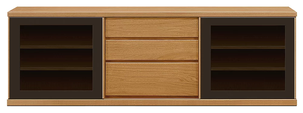 天然木突板を使用した1点ごとに木の表情の違う、シンプルながら天然木の趣が漂うシリーズです。商品左右は引き⼾タイプのガラス⼾で、中央は引き出しです。