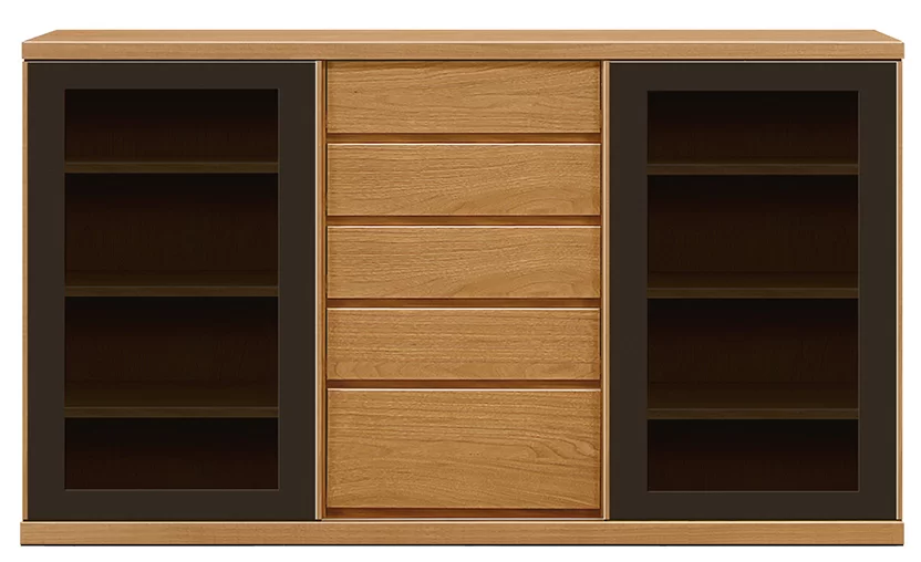 商品左右は引き⼾タイプのガラス⼾で、中央は引き出しです。商品の高さに応じて引き出しの段数が変わります。(高さ64センチ:3段、高さ80センチ:4段、高さ96センチ:5段、高さ112センチ:6段)