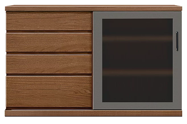 商品左右は引き⼾タイプのガラス⼾で、中央は引き出しです。商品の高さに応じて引き出しの段数が変わります。(高さ64センチ:3段、高さ80センチ:4段、高さ96センチ:5段、高さ112センチ:6段)