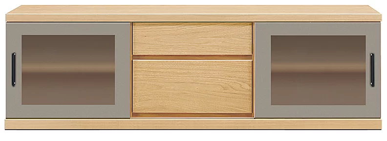 天然木突板を使用した1点ごとに木の表情の違う、シンプルながら天然木の趣が漂うシリーズです。商品左右は引き⼾タイプのガラス⼾で、中央は引き出しです。