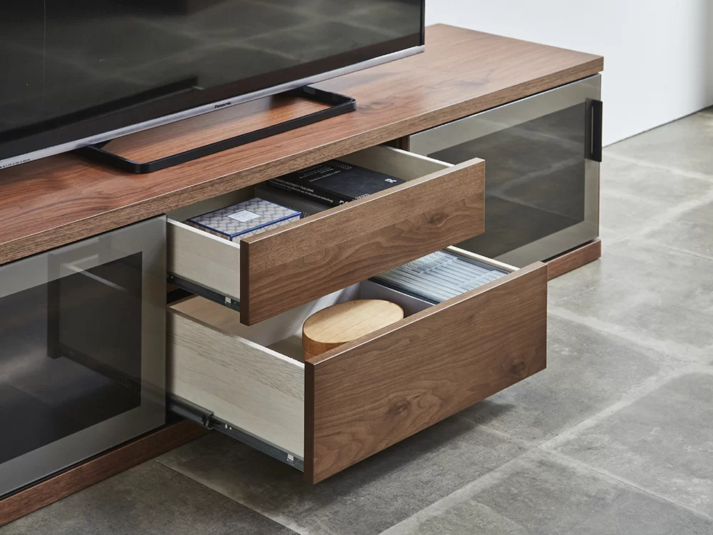ブラウンガラスがお部屋をスタイリッシュに演出します。また、ガラス⼾内には、レコーダーなどのAV機器が多い方にはもちろん、ちょっとしたコレクションなども収納してみるのもおすすめです。