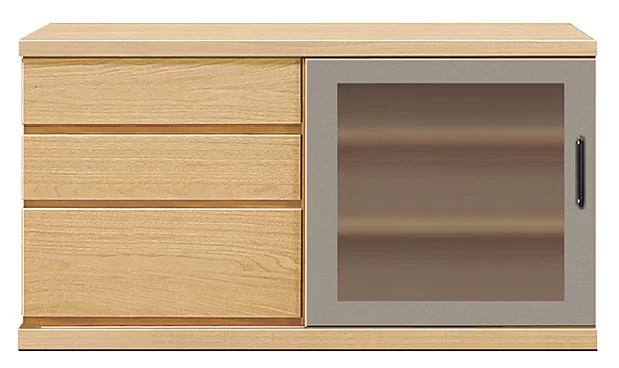 天然木突板を使用した1点ごとに木の表情の違う、シンプルながら天然木の趣が漂うシリーズです。商品左右は引き⼾タイプのガラス⼾で、中央は引き出しです。