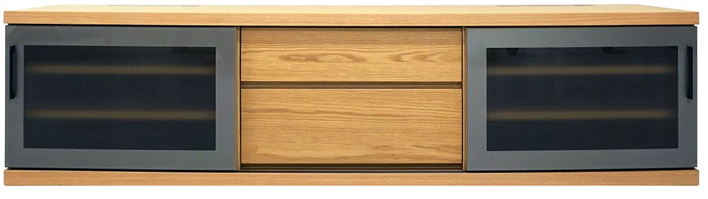 天然木突板を使用した1点ごとに木の表情の違う、シンプルながら天然木の趣が漂うシリーズです。商品左右は引き⼾タイプのガラス⼾で、中央は引き出しです。
