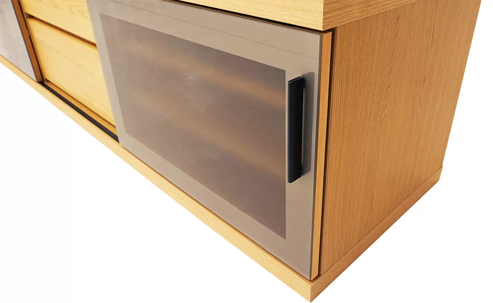 天然木突板を使用した1点ごとに木の表情の違う、シンプルながら天然木の趣が漂うシリーズです。商品左右は引き⼾タイプのガラス⼾で、中央は引き出しです。