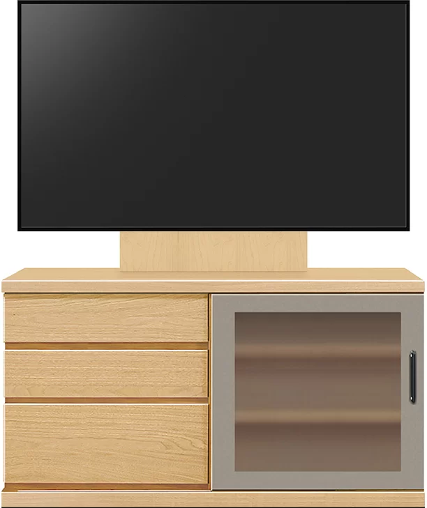 天然木突板を使用した1点ごとに木の表情の違う、シンプルながら天然木の趣が漂うシリーズです。商品左右は引き⼾タイプのガラス⼾で、中央は引き出しです。