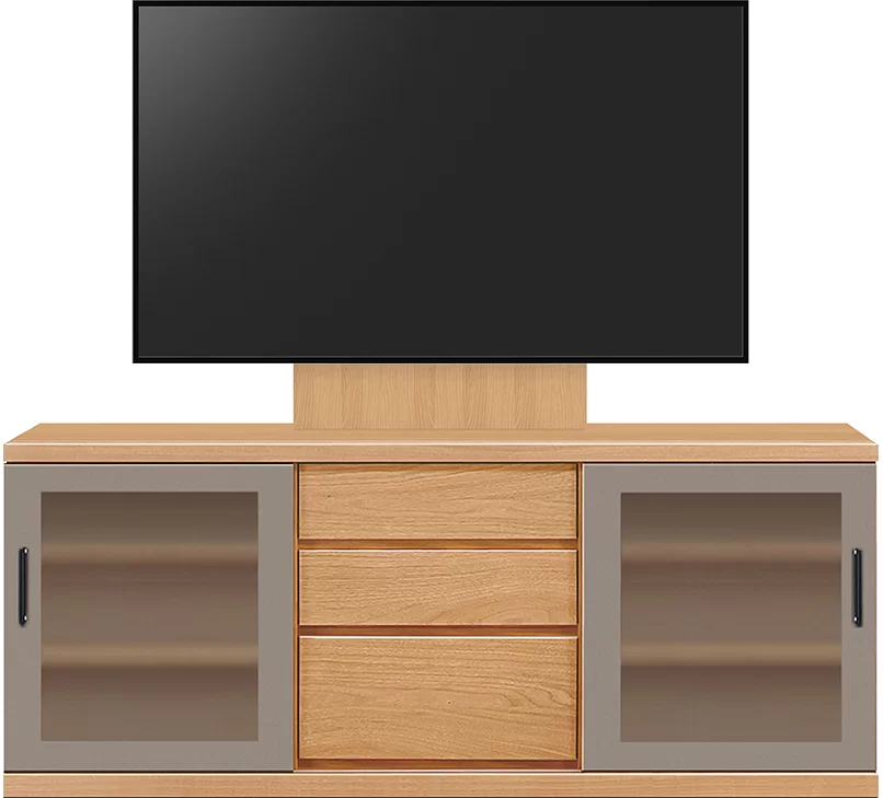 天然木突板を使用した1点ごとに木の表情の違う、シンプルながら天然木の趣が漂うシリーズです。商品左右は引き⼾タイプのガラス⼾で、中央は引き出しです。