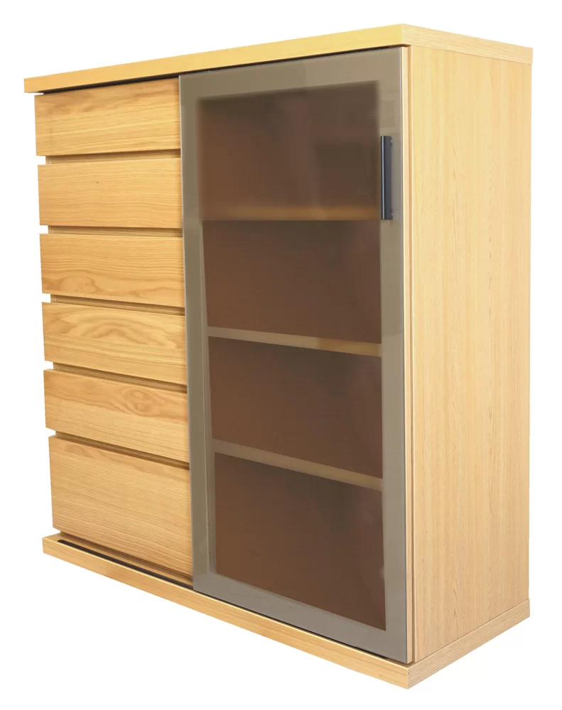 商品左右は引き⼾タイプのガラス⼾で、中央は引き出しです。商品の高さに応じて引き出しの段数が変わります。(高さ64センチ:3段、高さ80センチ:4段、高さ96センチ:5段、高さ112センチ:6段)
