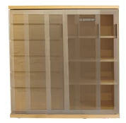 商品左右は引き⼾タイプのガラス⼾で、中央は引き出しです。商品の高さに応じて引き出しの段数が変わります。(高さ64センチ:3段、高さ80センチ:4段、高さ96センチ:5段、高さ112センチ:6段)