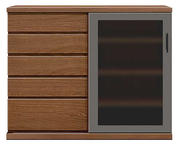 商品左右は引き⼾タイプのガラス⼾で、中央は引き出しです。商品の高さに応じて引き出しの段数が変わります。(高さ64センチ:3段、高さ80センチ:4段、高さ96センチ:5段、高さ112センチ:6段)