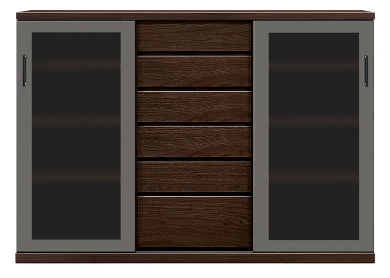 商品左右は引き⼾タイプのガラス⼾で、中央は引き出しです。商品の高さに応じて引き出しの段数が変わります。(高さ64センチ:3段、高さ80センチ:4段、高さ96センチ:5段、高さ112センチ:6段)