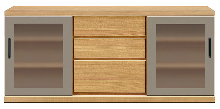 天然木突板を使用した1点ごとに木の表情の違う、シンプルながら天然木の趣が漂うシリーズです。商品左右は引き⼾タイプのガラス⼾で、中央は引き出しです。