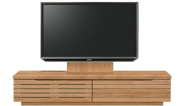 印象的なスリットをデザインし、前板に無垢材を使用した上品かつモダンなシリーズです。前板にスリットがあるため収納内のAV機器との接続もスムーズに行えます。商品左はフラップダウン扉になっており、右は引き出しになっています。