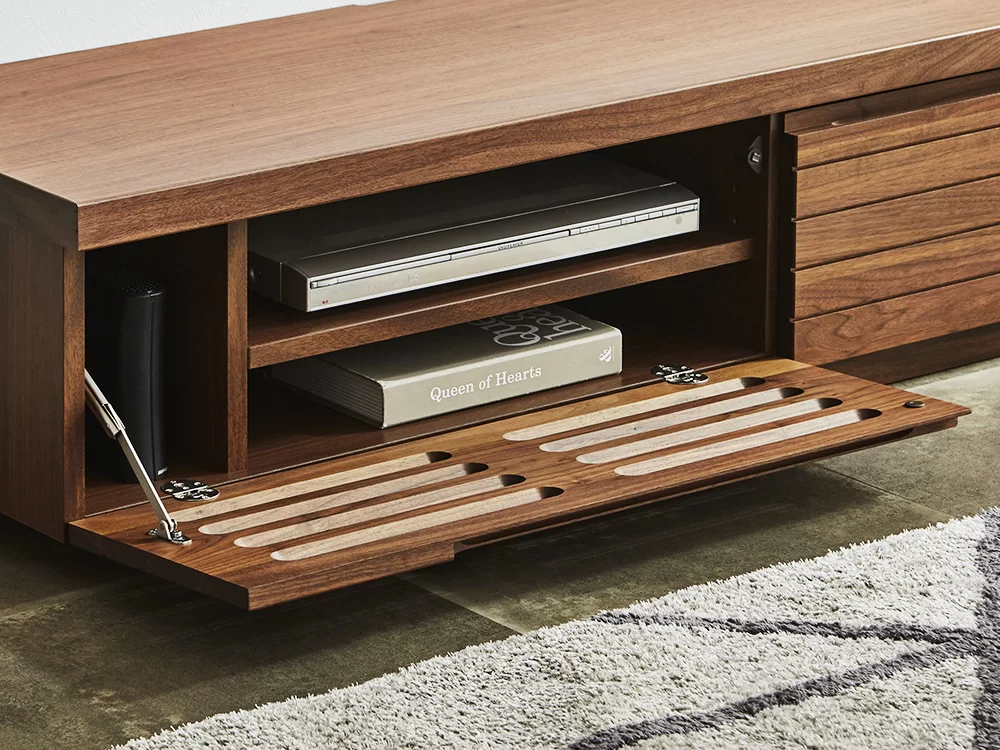 印象的なスリットをデザインし、前板に無垢材を使用した上品かつモダンなシリーズです。前板にスリットがあるため収納内のAV機器との接続もスムーズに行えます。商品左はフラップダウン扉になっており、右は引き出しになっています。