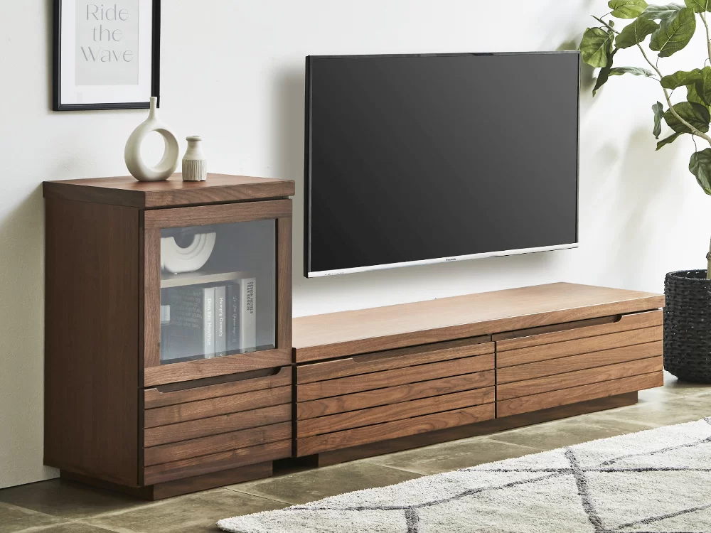 印象的なスリットをデザインし、前板に無垢材を使用した上品かつモダンなシリーズです。前板にスリットがあるため収納内のAV機器との接続もスムーズに行えます。商品左はフラップダウン扉になっており、右は引き出しになっています。