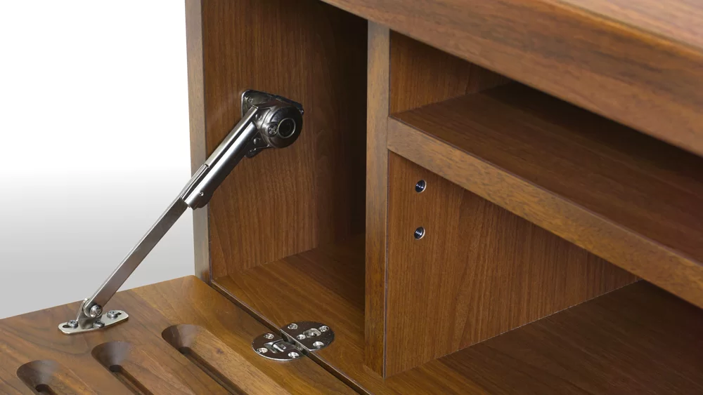 ソフトダウンステイフラップ扉はゆっくり閉まるソフトダウンステイを使用しているので、開閉音が気になりません。また、指を挟むなどのケガの防止にもなります。