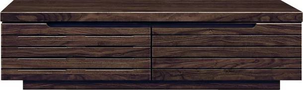 印象的なスリットをデザインし、前板に無垢材を使用した上品かつモダンなシリーズです。前板にスリットがあるため収納内のAV機器との接続もスムーズに行えます。商品左はフラップダウン扉になっており、右は引き出しになっています。