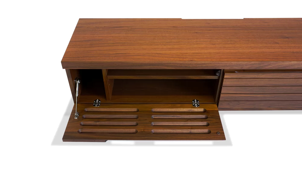 印象的なスリットをデザインし、前板に無垢材を使用した上品かつモダンなシリーズです。前板にスリットがあるため収納内のAV機器との接続もスムーズに行えます。商品左はフラップダウン扉になっており、右は引き出しになっています。