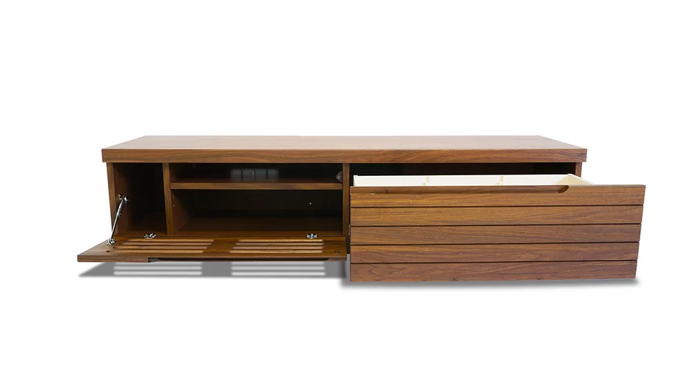 印象的なスリットをデザインし、前板に無垢材を使用した上品かつモダンなシリーズです。前板にスリットがあるため収納内のAV機器との接続もスムーズに行えます。商品左はフラップダウン扉になっており、右は引き出しになっています。
