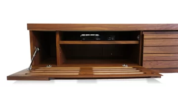 印象的なスリットをデザインし、前板に無垢材を使用した上品かつモダンなシリーズです。前板にスリットがあるため収納内のAV機器との接続もスムーズに行えます。商品左はフラップダウン扉になっており、右は引き出しになっています。