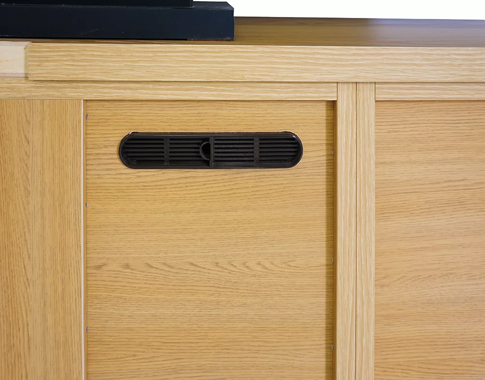 (AV引出)ダークグレーガラスを採用することにより中のものが見えにくくなっています。赤外線を通すことができるため、扉を閉めたままでも楽にDVDレコーダー等を使用できます。