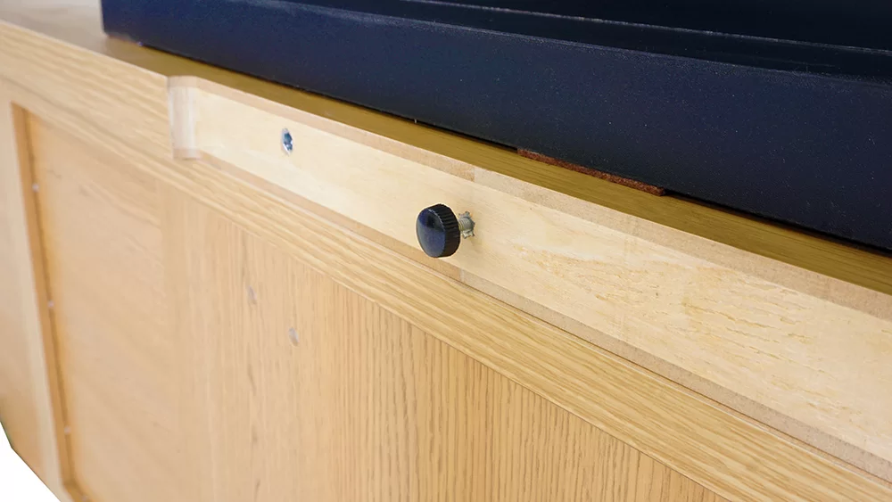 転倒防止機能天板の後ろには、テレビの転倒防止ベルトを付けることができる、ユリアねじが付いています。