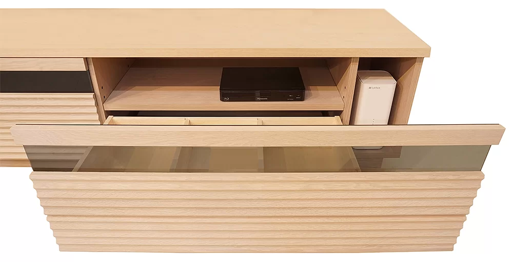 引出し内部にはDVDや小物など収納可能。棚板は可動式で、上にブルーレイデッキなどを置くことができます。引出しの横には、ルーターやゲーム機・コード溜まりに使用できるスペースがあり便利です。
