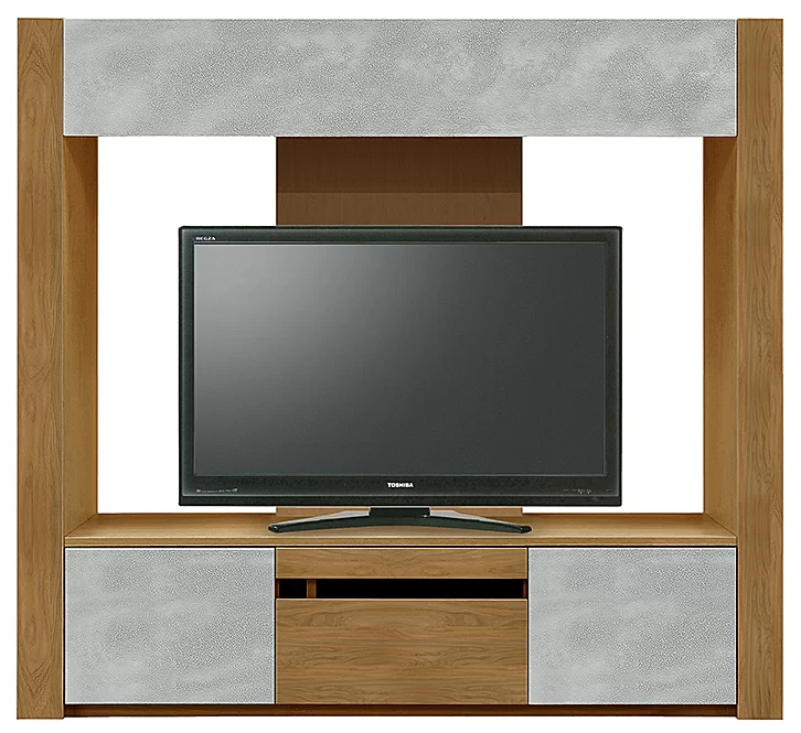 コンクリート調の扉がアクセントの収納付きTVボードです。ローボード中央の収納部は下部が引出、上部がデッキ収納部になっています。左右の扉内部は、可動棚になっていて収納物に合わせて調節が可能です。商品上部はフラップアップの扉になっていて、ローボードよりも多くの物を収納できます。TV壁掛けパネルにも対応しています。天然木無垢、突板を使用しておりますので、木目や色等が画像とは1点ごとに異なります。