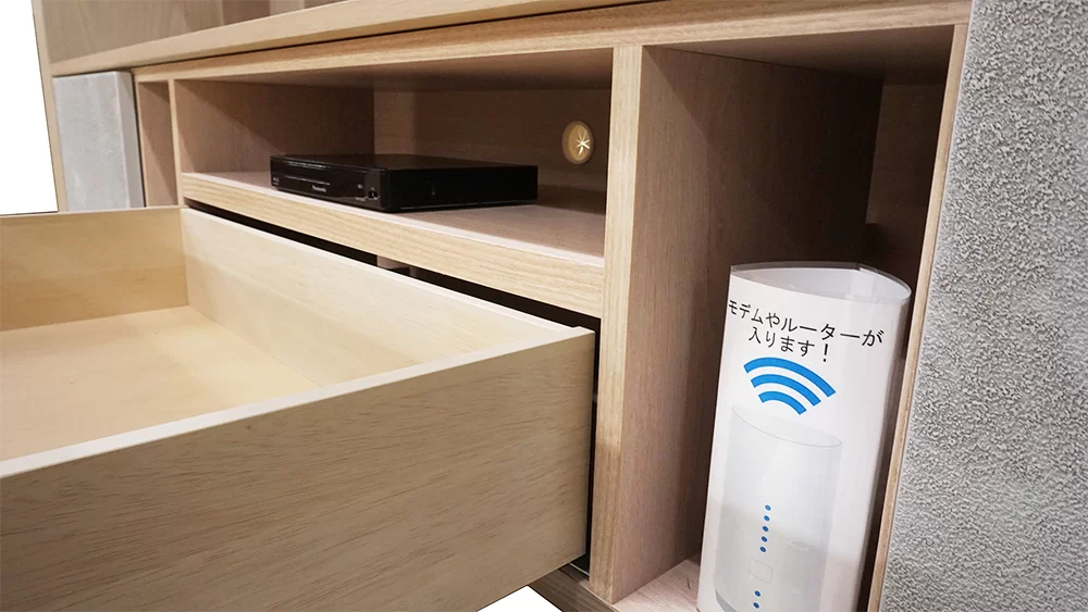 縦長の物も収納可能置き場所に困るWifiルーターなどの縦長の機材も引出内に収納可能。(一部サイズには上記スペースがない物もあります)