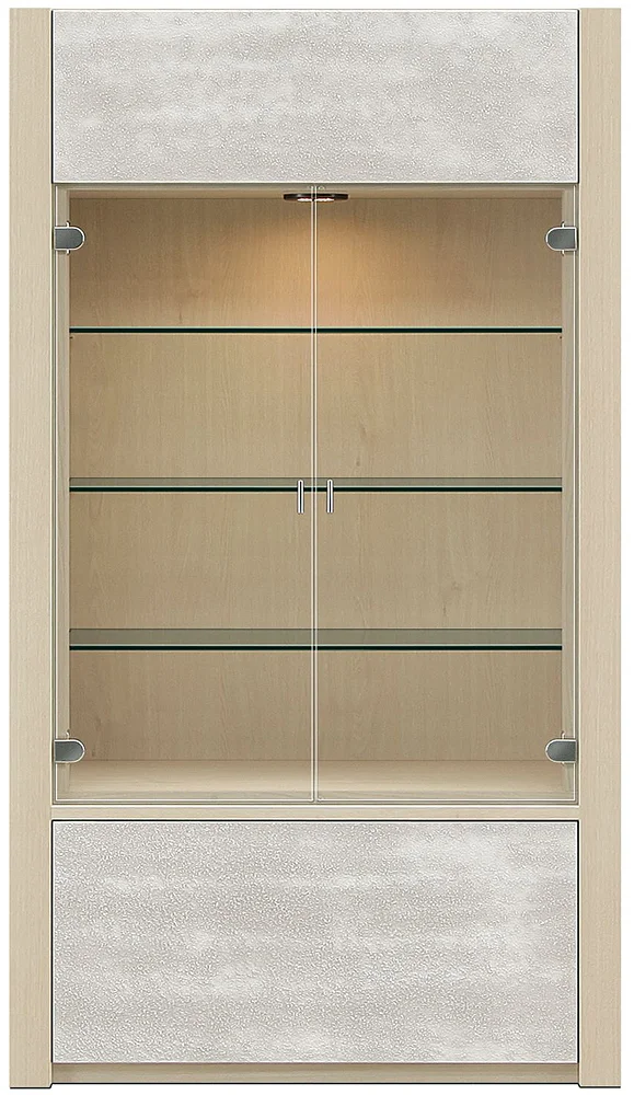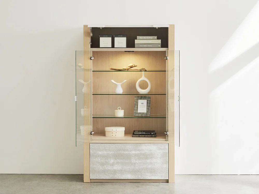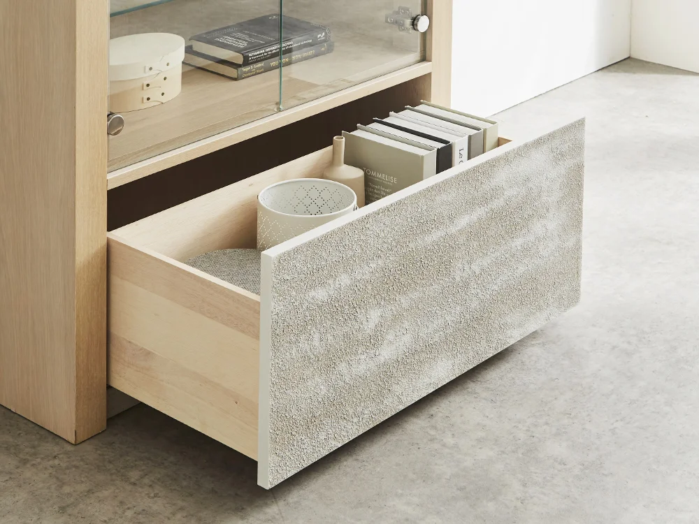 コンクリート調の扉がアクセントのキャビネットです。キャビネット中央の収納部はLED付仕様で、収納物にスポットライトを当て、高級感を演出できます。上の扉は、フラップ扉になっており、ちょっとしたものの収納などに一役買います。商品下部は引出になっていて高さのある物などの収納が可能です。