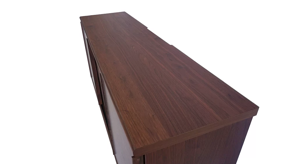 幅120cm、高さ75cmのサイドボード(ウォールナット)です。天然木突板を使用した1点ごとに木の表情の違う、シンプルながら天然木の趣が漂うシリーズです。高さ12cmの木製脚(アジャスター付)を採用し、スタイリッシュな空間を演出します。足空間はお掃除ロボットも通ります。壁掛けパネルセットにも対応しています。