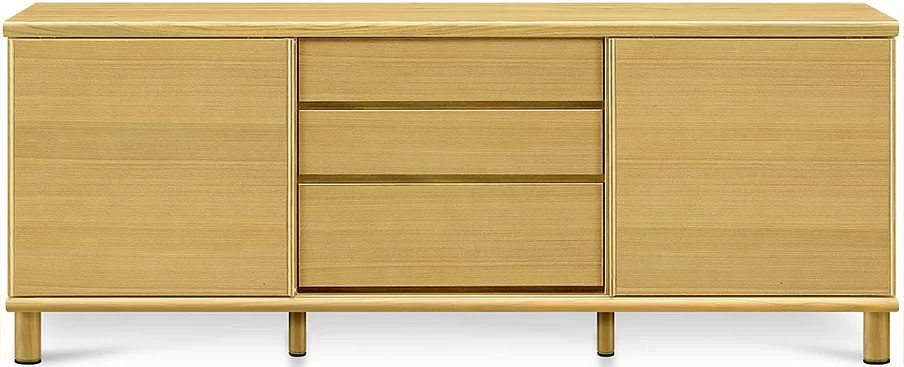 幅190cm、高さ75cmのサイドボードです。天然木突板を使用した1点ごとに木の表情の違う、シンプルながら天然木の趣が漂うシリーズです。高さ12cmの円形木製脚を採用し、スタイリッシュな空間を演出します。足空間はお掃除ロボットも通ります。壁掛けパネルセットにも対応しています。