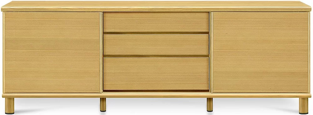 幅210cm、高さ75cmのサイドボードです。天然木突板を使用した1点ごとに木の表情の違う、シンプルながら天然木の趣が漂うシリーズです。高さ12cmの円形木製脚を採用し、スタイリッシュな空間を演出します。足空間はお掃除ロボットも通ります。壁掛けパネルセットにも対応しています。