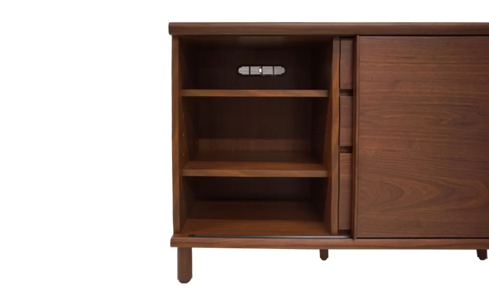 天然木突板を使用した1点ごとに木の表情の違う、シンプルながら天然木の趣が漂うシリーズです。扉は使いやすく場所を取らない引戸を採用し、スムーズに動くローラーを使用しています。木製脚(アジャスター付)の高さが12cmあるので、スタイリッシュさもあり、お掃除ロボットも通過できます。引き戸にはブロンズガラスを使用しており、赤外線を通しつつも、中が見えにくい仕様となっております。また、ローボードには別売りの壁掛けパネルセットを取り付けて気軽に壁掛けスタイルを楽しめます。カラーはウォールナットとオークナチュラルから選べます。