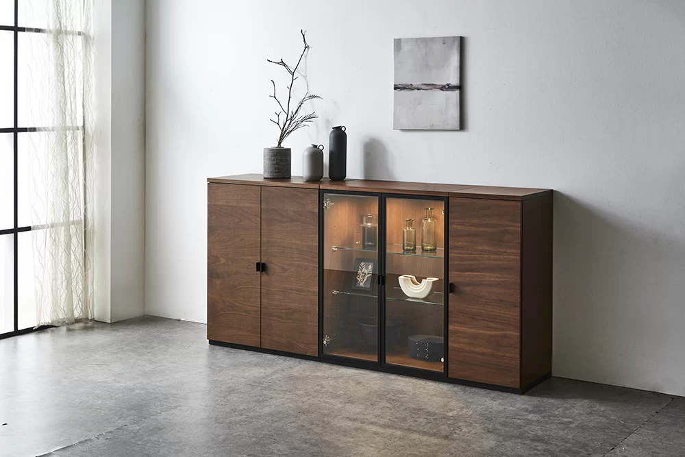 天然木突板の扉とガラスの扉が選べる、ナチュラルモダンチックなキャビネットです。カラーはウォールナットとオークホワイトをご用意しております。高さが183cmと96cm、幅が76cm(両開き)と38cm(片開き)よりお選びいただけます。さらに連結できるよう設計していますので組み合わせも自由です。※同じ高さでの連結になります。ガラス扉の中にはLED照明付きです。
