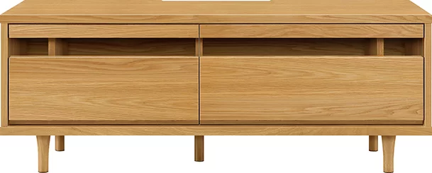 天然無垢を前面扉に使用したシンプルながらも上品な印象を与えるローボードです。脚付きなので、スタイリッシュさもあり、お掃除ロボットなども通ります。左右は引出になっており、ソフトクローズレールを使用しているため、ゆっくり静かに引出が閉まります。TV壁掛けパネルにも対応しております。天然木無垢、突板を使用しておりますので、木目や色等が画像とは1点ごとに異なります。発注から納品まで最短45日要します。