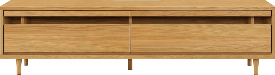 天然無垢を前面扉に使用したシンプルながらも上品な印象を与えるローボードです。脚付きなので、スタイリッシュさもあり、お掃除ロボットなども通ります。左右は引出になっており、ソフトクローズレールを使用しているため、ゆっくり静かに引出が閉まります。TV壁掛けパネルにも対応しております。天然木無垢、突板を使用しておりますので、木目や色等が画像とは1点ごとに異なります。発注から納品まで最短45日要します。