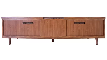 天然無垢を前面扉に使用したシンプルながらも上品な印象を与えるローボードです。脚付きなので、スタイリッシュさもあり、お掃除ロボットなども通ります。左右は引出になっており、ソフトクローズレールを使用しているため、ゆっくり静かに引出が閉まります。TV壁掛けパネルにも対応しております。天然木無垢、突板を使用しておりますので、木目や色等が画像とは1点ごとに異なります。発注から納品まで最短45日要します。