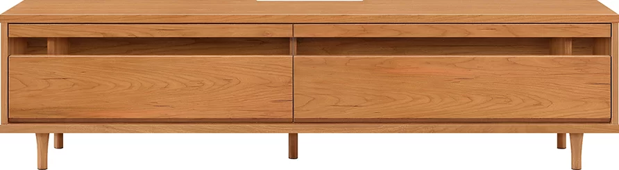 天然無垢を前面扉に使用したシンプルながらも上品な印象を与えるローボードです。脚付きなので、スタイリッシュさもあり、お掃除ロボットなども通ります。左右は引出になっており、ソフトクローズレールを使用しているため、ゆっくり静かに引出が閉まります。TV壁掛けパネルにも対応しております。天然木無垢、突板を使用しておりますので、木目や色等が画像とは1点ごとに異なります。発注から納品まで最短45日要します。