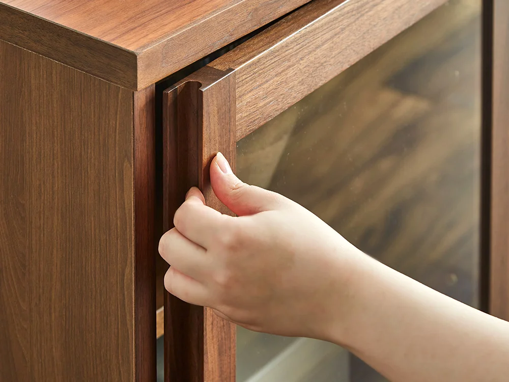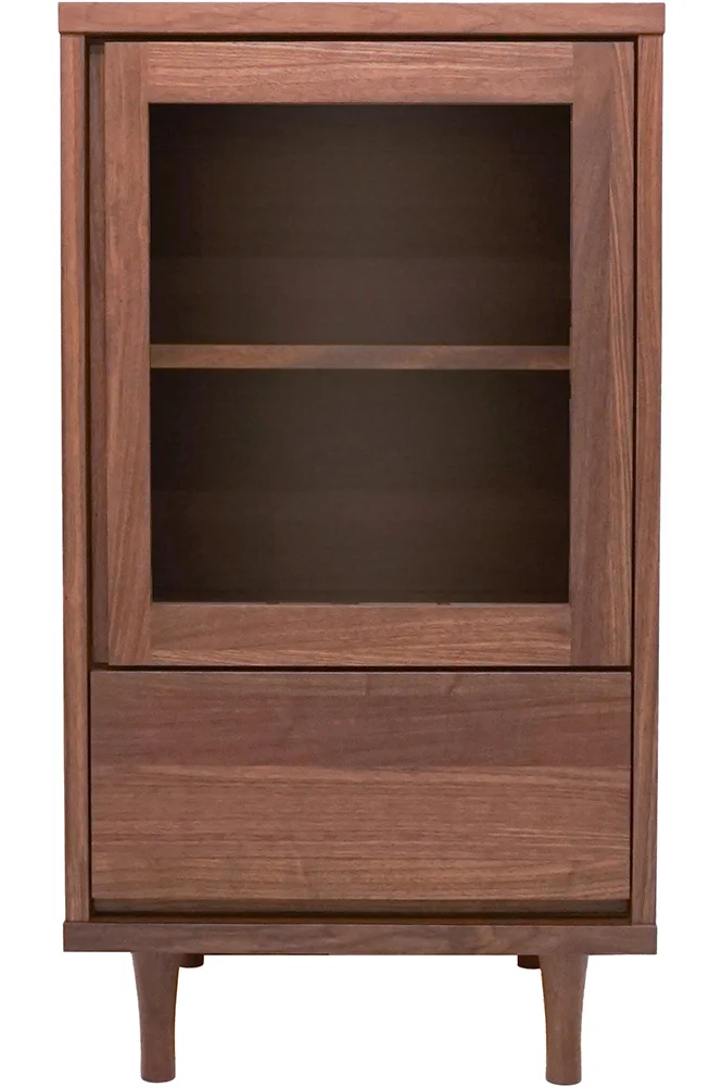 天然無垢を前面扉に使用したシンプルながらも上品な印象を与えるキャビネットです。脚付きなので、スタイリッシュさもあります。ガラス扉と板扉の二種類があり、それぞれ右開きまたは左開きを選ぶことができます。天然木無垢、突板を使用しておりますので、木目や色等が画像とは1点ごとに異なります。発注から納品まで二か月程度要します。