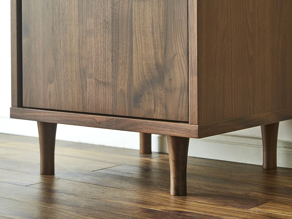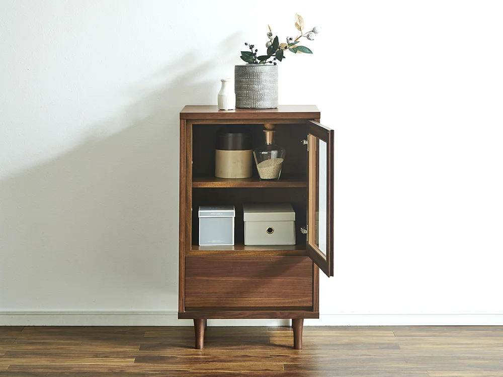 天然無垢を前面扉に使用したシンプルながらも上品な印象を与えるキャビネットです。脚付きなので、スタイリッシュさもあります。上部は片開きの開き戸、下部はフルオープン仕様の引出になっています。開き戸は扉の向きを左右お好みの向きに付け替えることができます。