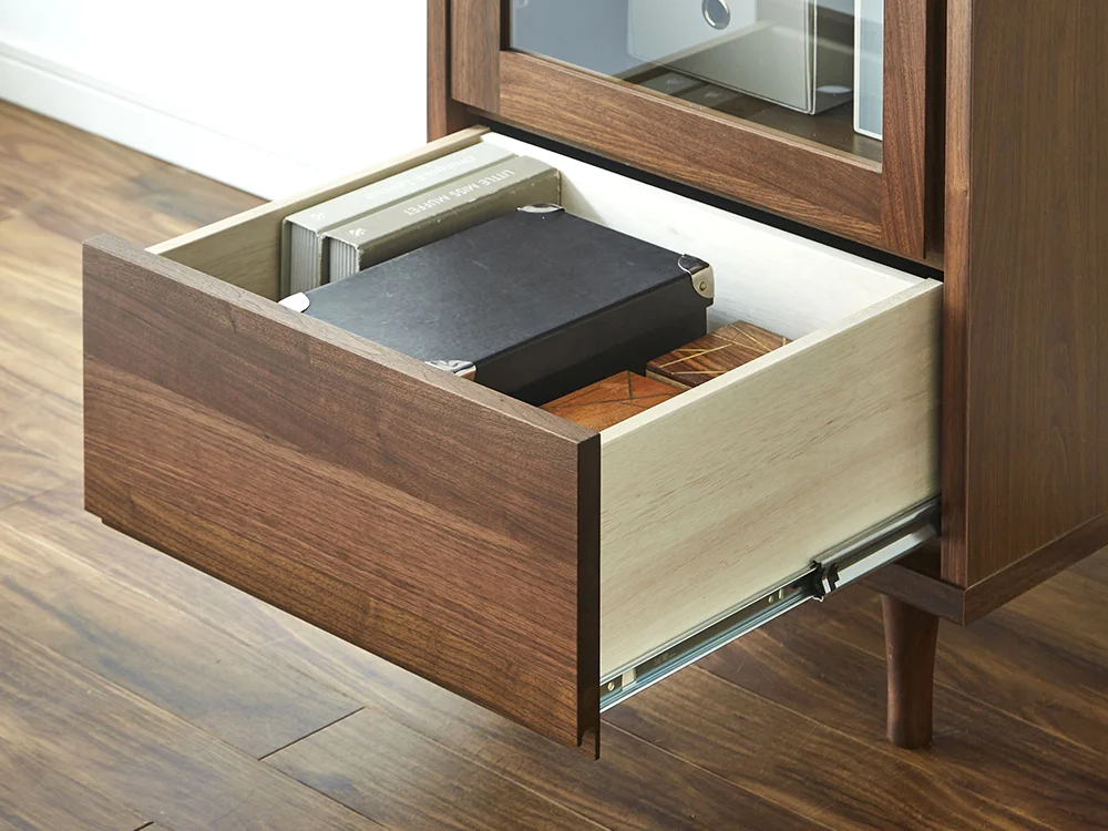 出し入れ楽々ガラスキャビネットにはフルオープン仕様の引出を採用しているので、奥に入れているものも中身を確認して、スムーズに出し入れする事ができます。