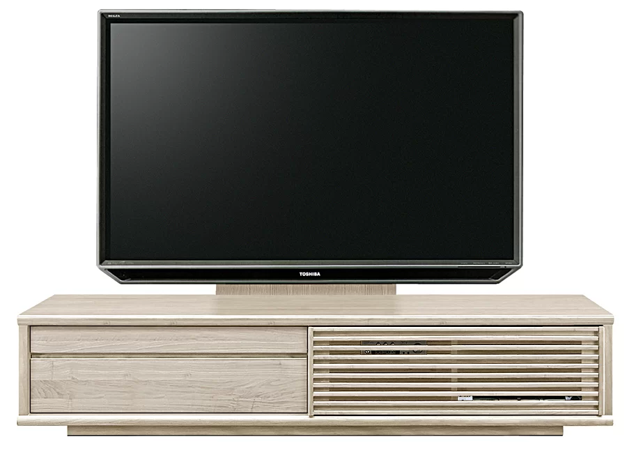 ルーバーを採用し和のテイストを取り入れたモダンなローボードです。右扉は引⼾仕様なので配線作業等で奥まで⼿を入れやすく、扉を開いた状態でも通路の邪魔にもなりません。左扉は上下引出になっており、下はDVD等を、上は小物や説明書等を収納するスペースとして最適です。全体的に柔らかい曲線で仕上げており、優しく空間に馴染みます。